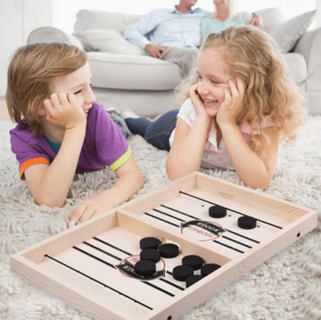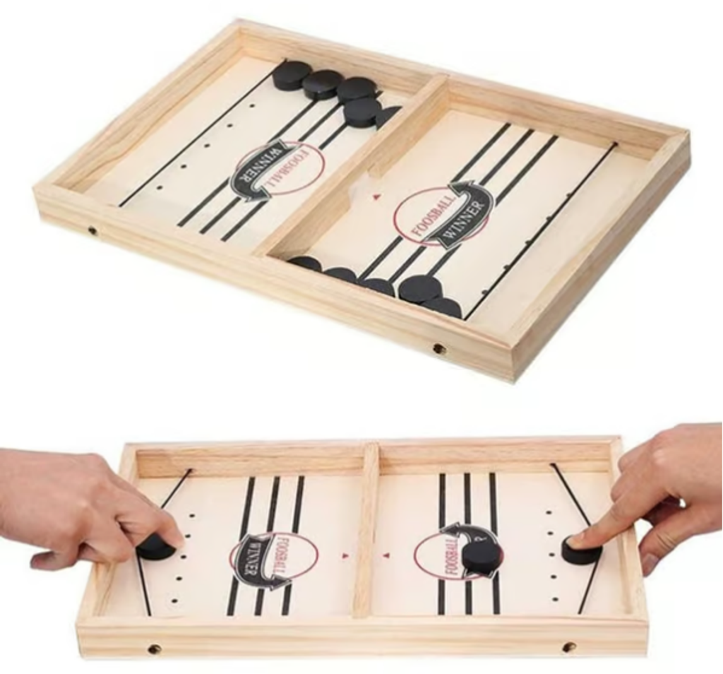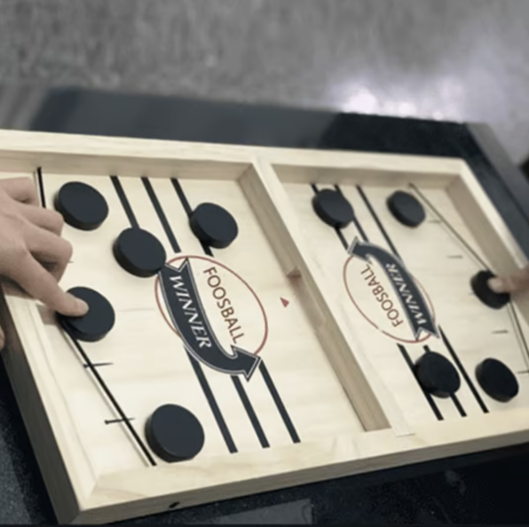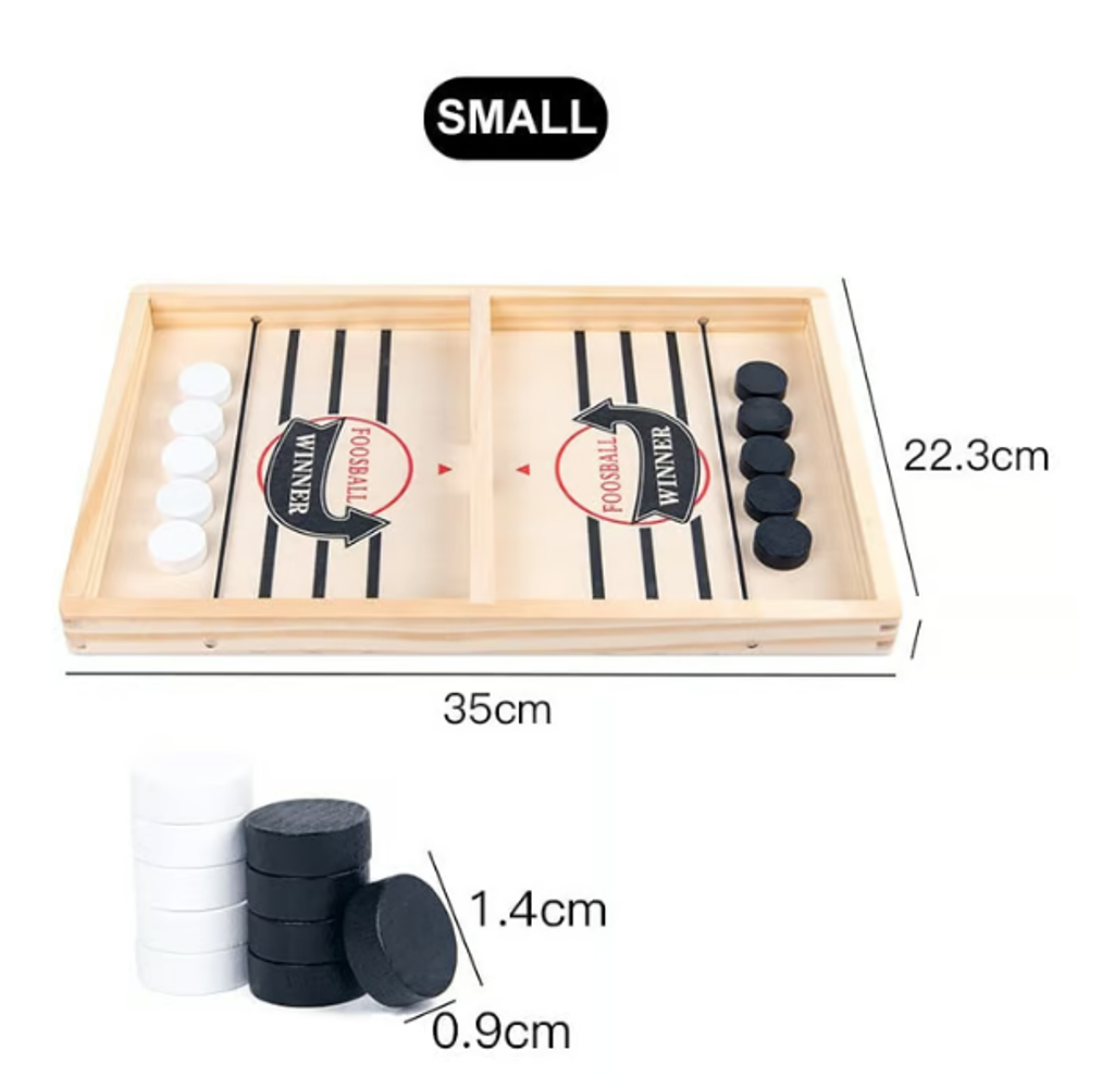 A game full of speed and action where the aim is to play all the pucks to the opposing player's side of the divided board, but the operation must be done with only one hand and the discs must be pushed through the opening to the other side using the rubber band! AVAILABLE IN SMALL OR LARGE!