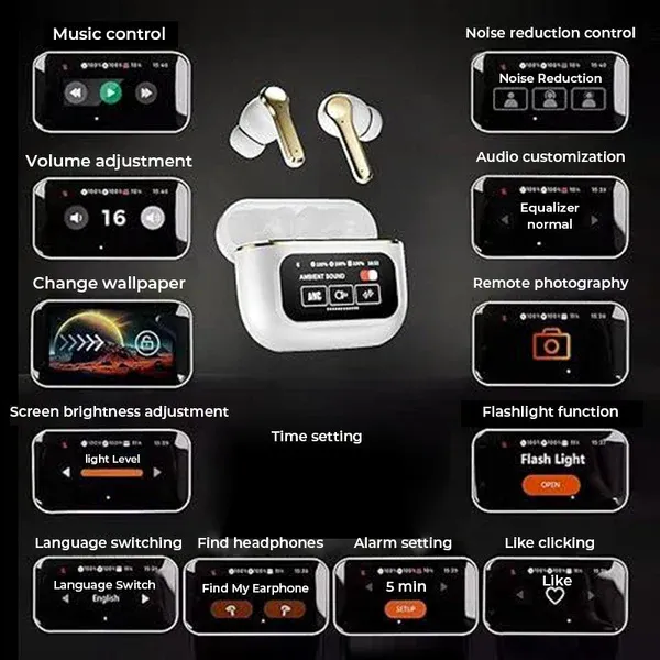 - Up to 13 functions: Music control, Volume control, Noise reduction mode switch, Balanced mode switching, Alarm setting, Screen brightness adjustment, 16 languages Toggle, Wallpaper Toggle, Find left and right headphones, LED lighting, Time setting, Short video Control, Camera Control.