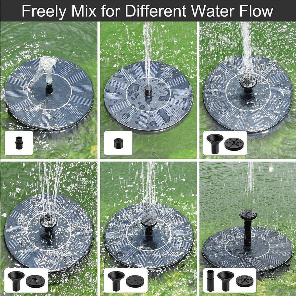 Solar Fountain Pump floats on the water and has no electric outlet or external battery. This product is suitable for bird bath, fish tank, small pond, garden decoration, water circulation for oxygen, etc.